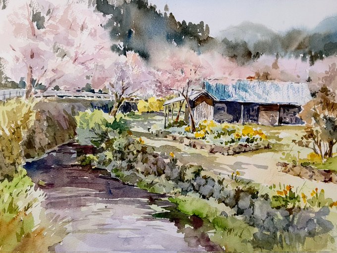 教室でのデモ。三色限定で描きました。#スケッチ #透明水彩画 #水彩画 #紫陽花 #3原色 #写生 #花 #watercolor #watercolour #threeprimarycolors #hydrangeas #aqurelle