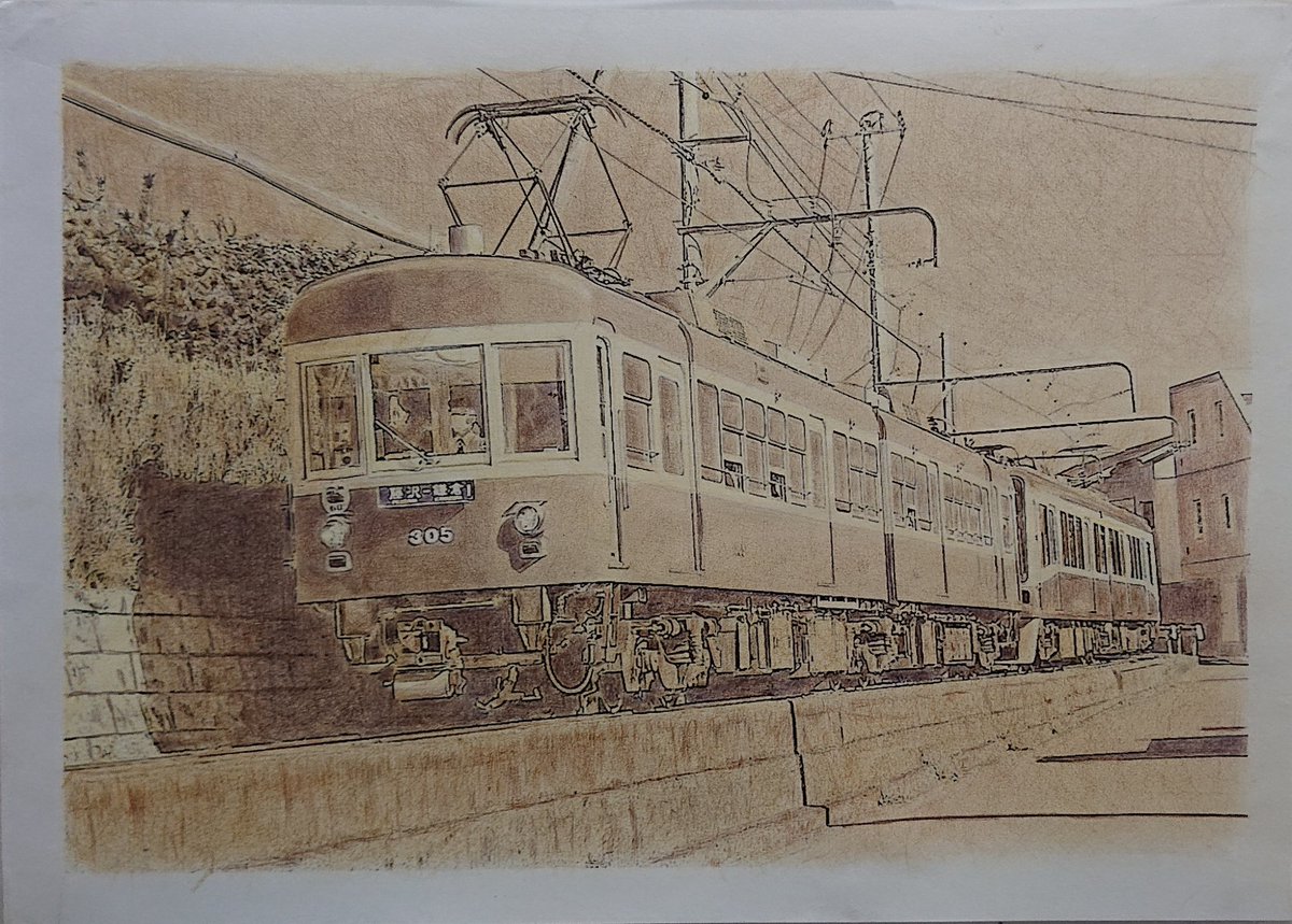 こんな事もやっています 写真を線画加工してくれるPILOT社 #写真でぬりえをつくろう を使って色鉛筆で塗った 「江ノ電(セピアバージョン)」 色鉛筆画と塗り絵の中間的な立ち位置です #大人の塗り絵 #写真塗り絵 #色鉛筆画 #色鉛筆 #江ノ電 #セピア風 #ファーバーカステル