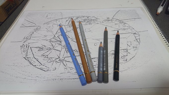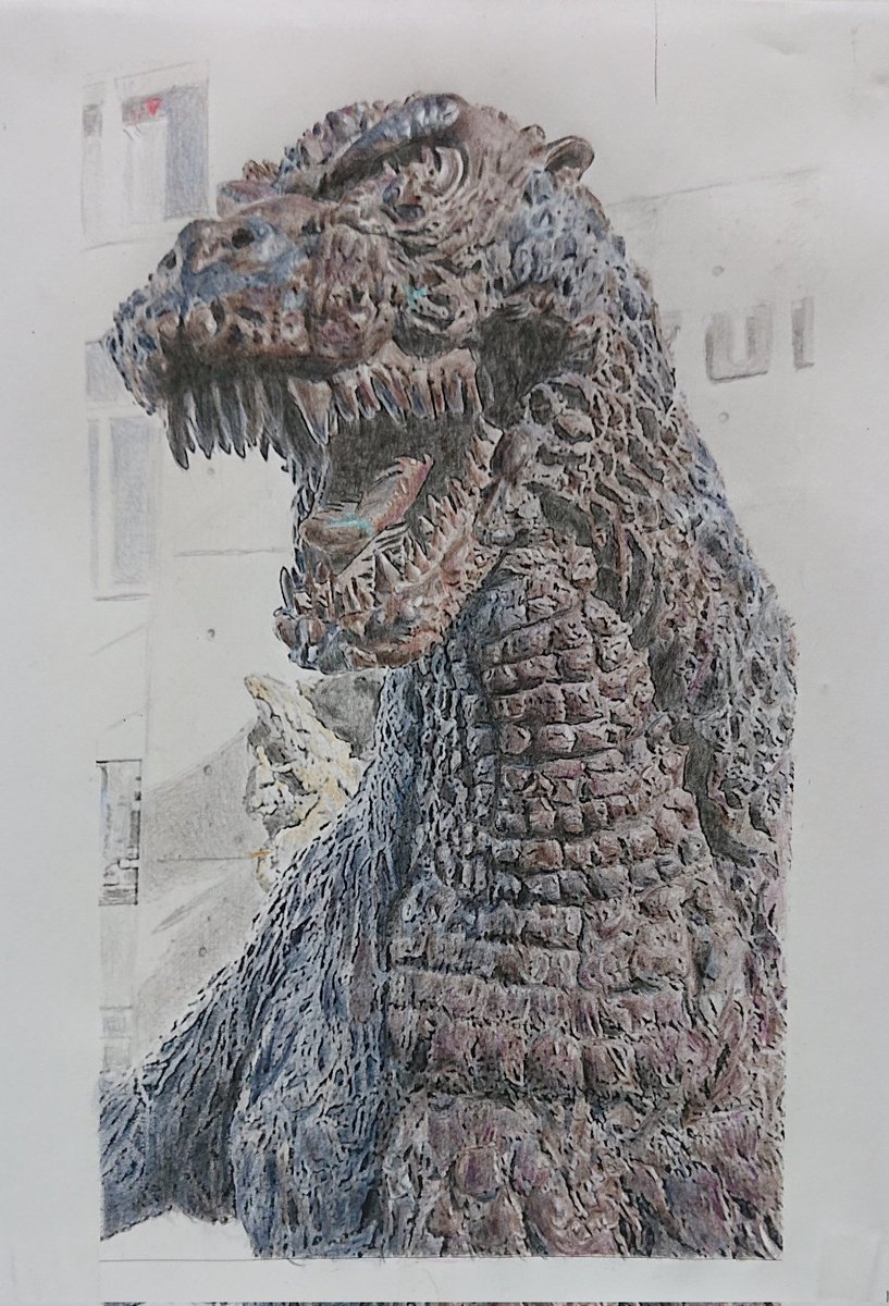ぼちぼち絵も載せていこう #ゴジラ の #塗り絵 PILOT社「写真でぬりえをつくろう」 pilot-nurie.jp で写真を線画に変換したものに #色鉛筆 で色づけしました 自分では #写真塗り絵 と呼んでます 塗り絵と #色鉛筆画 の中間的な感じ 東宝スタジオ前にあるゴジラの像です #ファーバーカステル