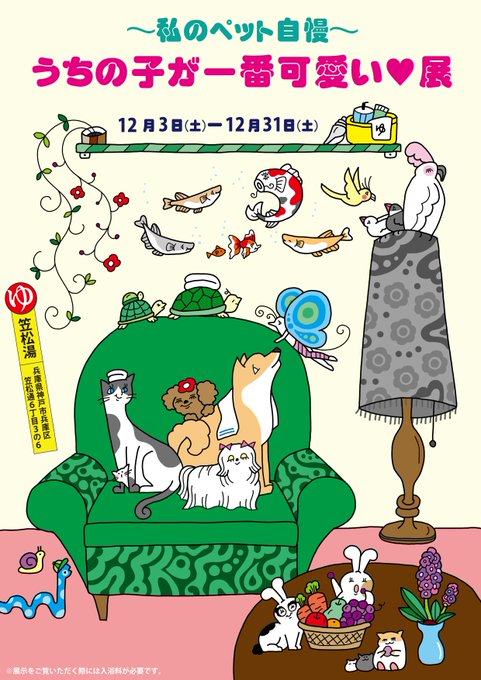 はじまりました! 〜私のペット自慢〜 うちの子が一番可愛い♥展 なんと! 限定缶バッジも販売中🙌🙌 可愛いまみれの浴室で 極楽気分♪ぜひぜひ☆ #笠松湯 #銭湯 #和田岬 #写真展 #ペット #缶バッジ #フラミンゴノリコイラスト twitter.com/bandai_musume/…