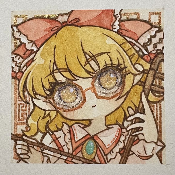 自機組ラストは冴月麟ちゃん!できました🙌🏻🙌🏻 八角の独特なデザインのメガネにしてみました⸜(*ˊᗜˋ*)⸝ 背景の模様も地味にこだわりポイント!! #ほまネキ入院記録 #東方Project #冴月麟 #透明水彩 #アナログイラスト #水彩画 #watercolour