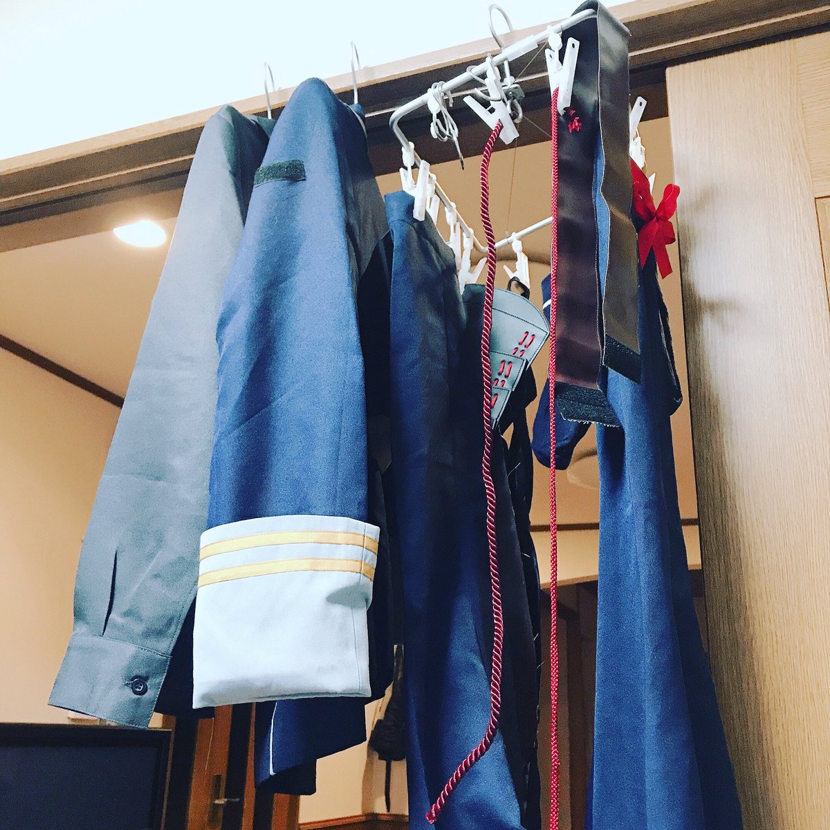 #刀剣男士を実際に着てみてわかったこと 防具の重さでジャケットずり落ちる→安ピン 動くとシャツ出てくる→シャツガーター 踁当てずり落ちる→ゴムと安ピン 襟が浮く→安ピン 肩の防具が浮く→安ピン 豊前江は安ピンまみれ