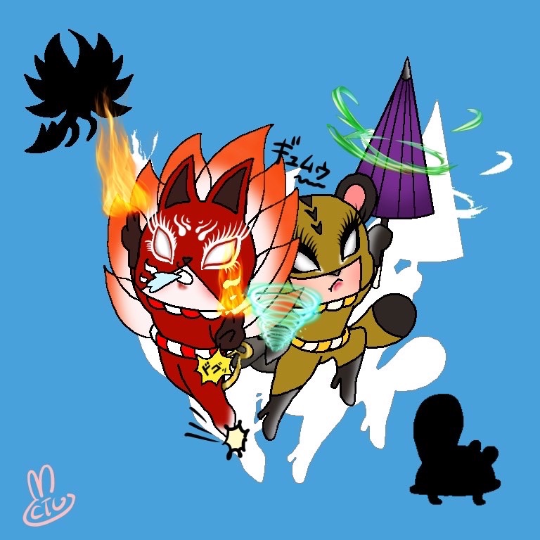 おはようございます🎐🦊 🔴九尾レッド&🟡分福イエロー 犬猿ならぬ狐狸の仲(ホントは仲良し) 🦊🗯茶釜がアテクシの御御足nドフゥウッッン‼︎ 🦝🗯アンタ尻尾多過ぎよ! 毟りなさい! #イラスト #妖怪 #九尾 #分福茶釜 #みんなで楽しむTwitter展覧会 #夏の創作クラスタフォロー祭り