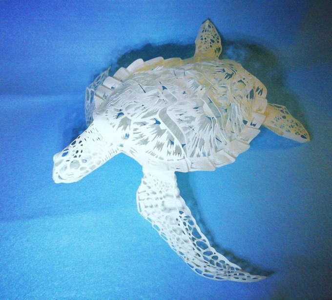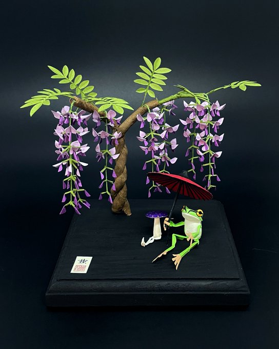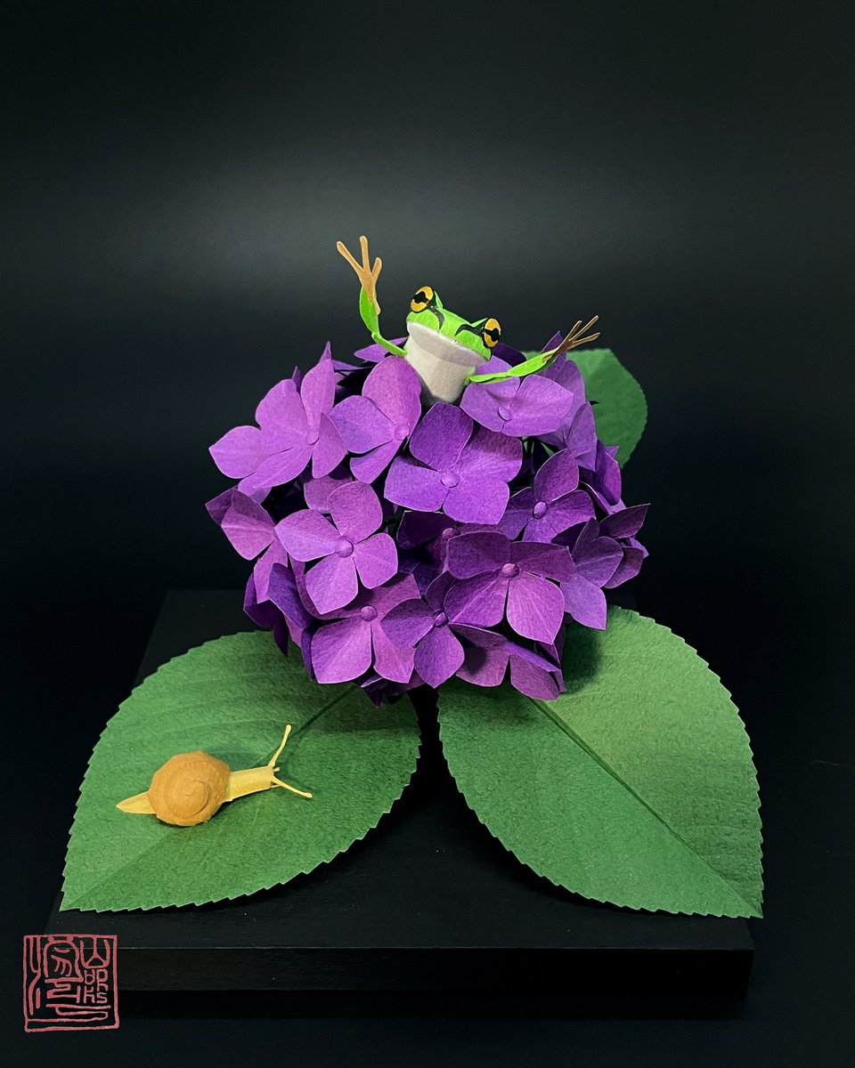 #過去作品あげて最近繋がった人びっくりさせよう大会 下絵なしでハサミで切り抜いて1枚で繋げたまんま立体にする #切り折り紙 カエルや花を作り始める前は1枚ルールで自分を縛って腕を磨いてました。 全部1枚目の繋がった紙でできてますぞい!