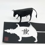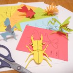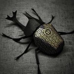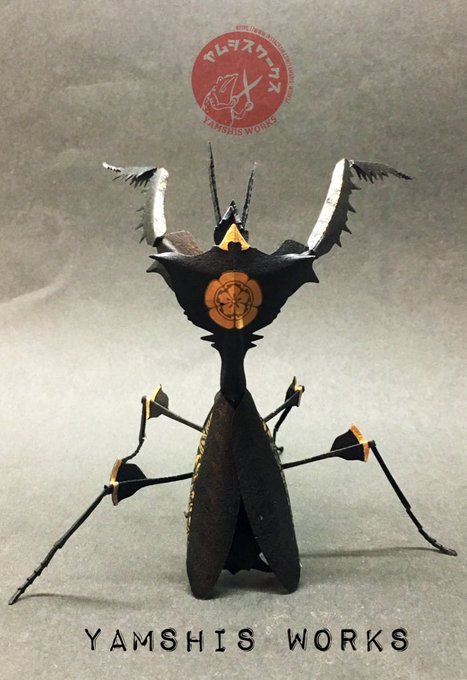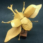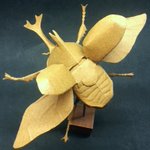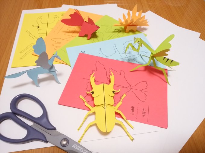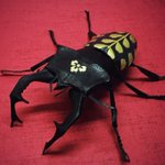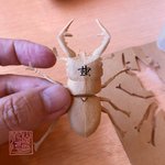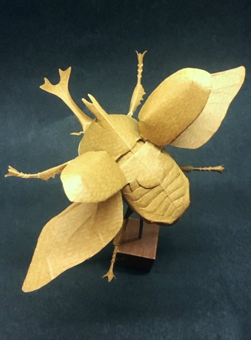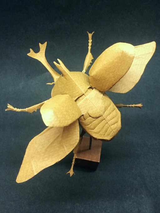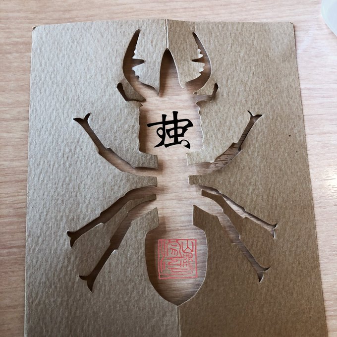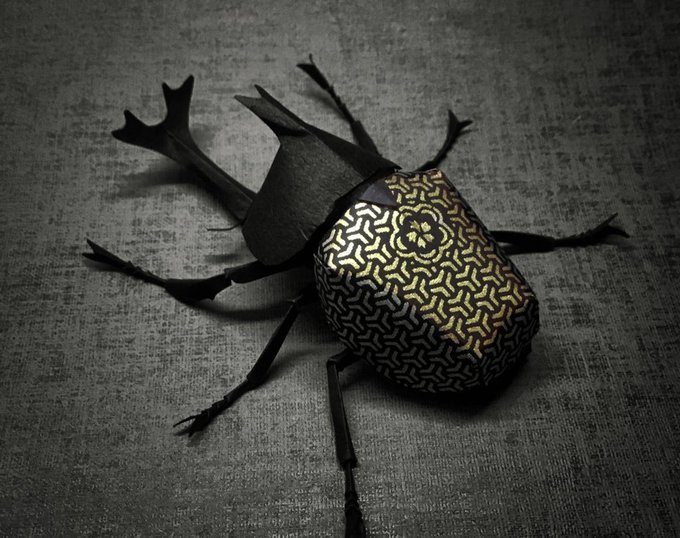 #画像を4枚晒したらrtがきてフォロワーがぶわーって増えると聞いて 半分に折った紙を下絵せずハサミで切り抜き、パーツ分けせず繋げたまま折ったり曲げたりして立体にする #切り折り紙 で甲虫達に小紋和紙で装飾した #武者蟲 作ります。お腹側まで全部1枚で繋がってます。 カッチョイイ!!