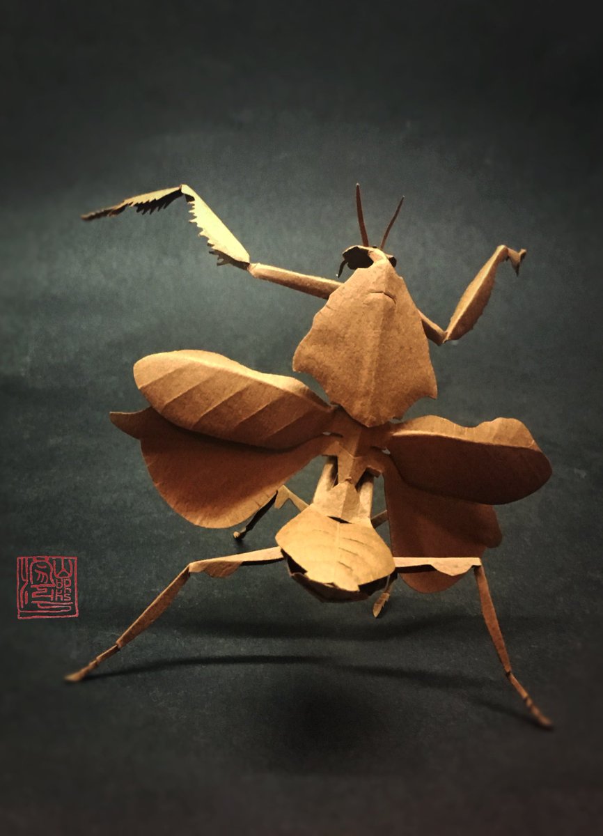 #ゴールデンウィークSNS展覧会2023 カエルと花やカブクワなど色々作りますが、 実は1番得意なのはカマキリだったりします。 半分に折った紙を下絵無しでハサミで切り抜き、1枚で繋がったまま折ったり曲げたりして糊付けなしで立体にします。 僕の作品の原点です。 #切り折り紙 twitter.com/yamshis_works/…
