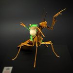 #自分は好きだけど伸びなかった作品 1枚目 #切り折り紙のカエル ヤドクシリーズ 2、3枚目 オッサンの人形遊びシルバニアと共に 4枚目 一枚の紙を下絵なしで切り抜いて糊付け無しで腹側まで繋げて折った #切り折り紙 ヒシムネカレハカマキリ 自分では超好きですが!