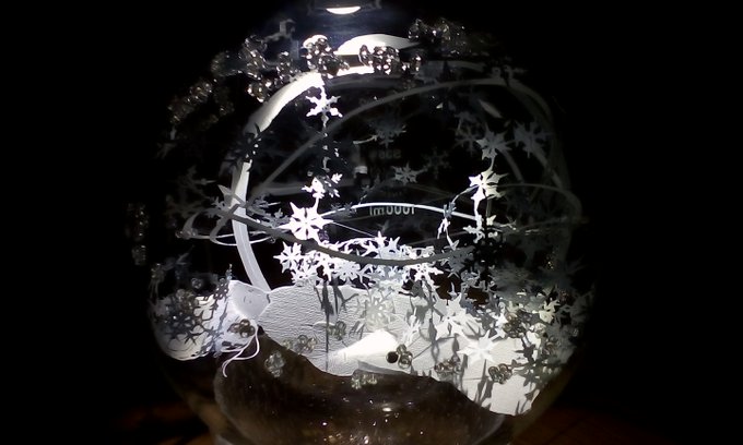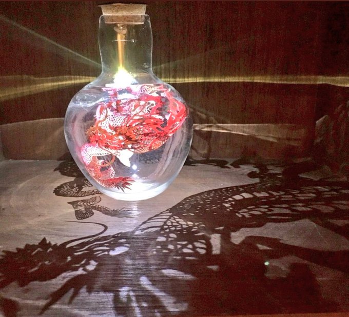 〈制作記〉 ウミガメの作品 「還る」 ウミガメはガラス容器(丸底フラスコ)の口径よりずっと大きいです。これは切り絵を折って作り、折り曲げてガラスに入れて、紙が元に戻ろうとする反発力を利用して浮かせています。動かないようにヒレの端をガラスに接着しています。 #切り絵ボトルアート twitter.com/kamiyahasse1/s…