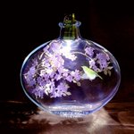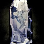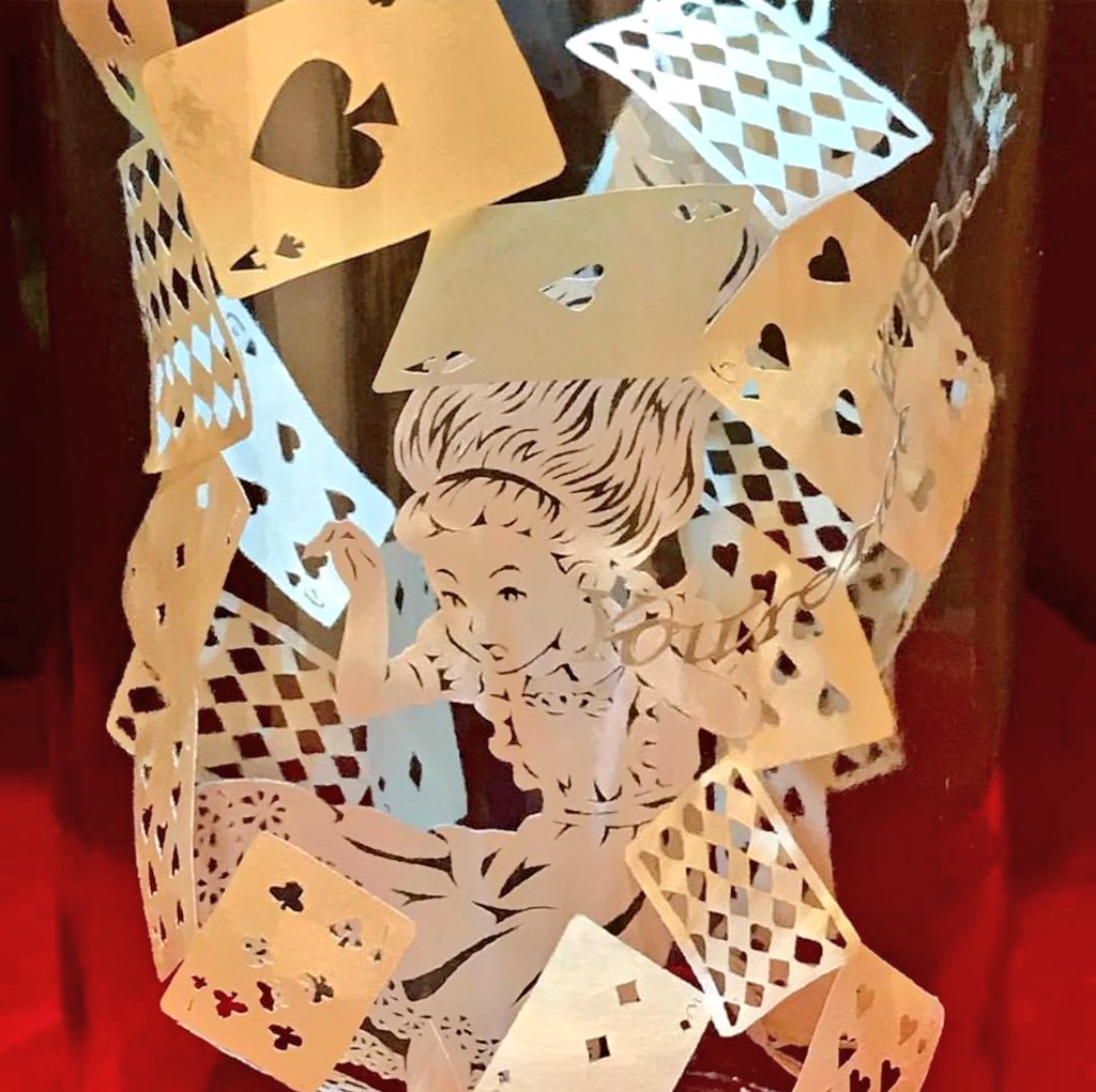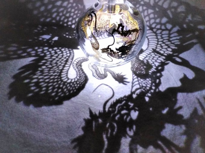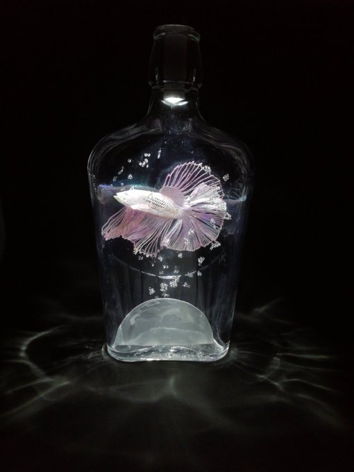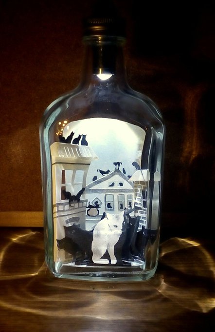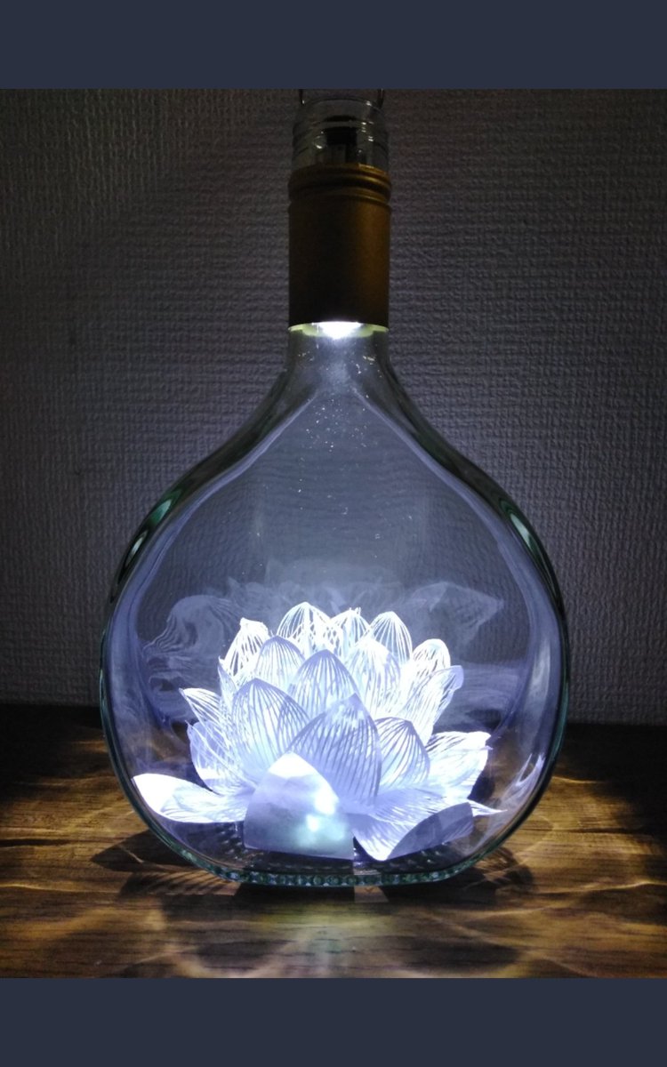 #多分私しかやってない 切り絵を立体化 ↓ 細く折り畳んでボトルの口から入れる ↓ 棒などを使い、ボトルの中で再び開く ↓ ボトルの内側から壁面に接着 ↓ ボトルの中で立体切り絵が浮く ↓ ボトルの口にライトを仕込む こんな面倒すぎることをやって作っています。 #切り絵ボトルアート