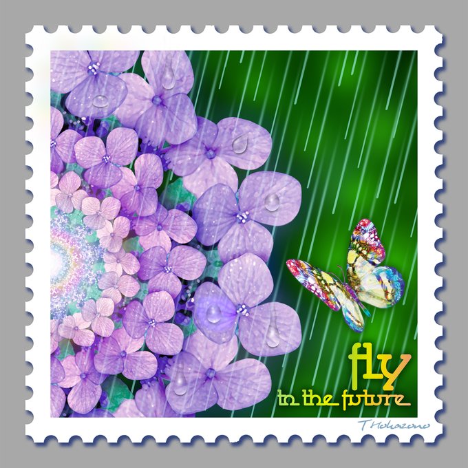 「Fly to the Future」 梅雨の強い雨に降られるアジサイと飛ぶ蝶です 切手のデザインにしてみました #蝶 #梅雨 #雨 #アジサイ #切手 #イラスト #アート #デジタルイラスト #アナログイラスト #グラフィックデザイン #絵描きさんと繋がりたい #イラスト好きな人と繋がりたい #フォトショップ