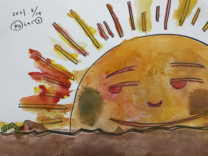 パパ、お月さまとって!の模写 夏休みのアートワーク🎨 子どもと一緒に描きました😊 #夏休み #幼稚園 #年少 #アートワーク #アート #art #絵の具 #水彩 #watercolor #watercolorpainting #混合技法 #mixedtechnique #mixedmedia #初めての絵の具 #3歳 #はらぺこあおむし #エリックカール #ericcarle