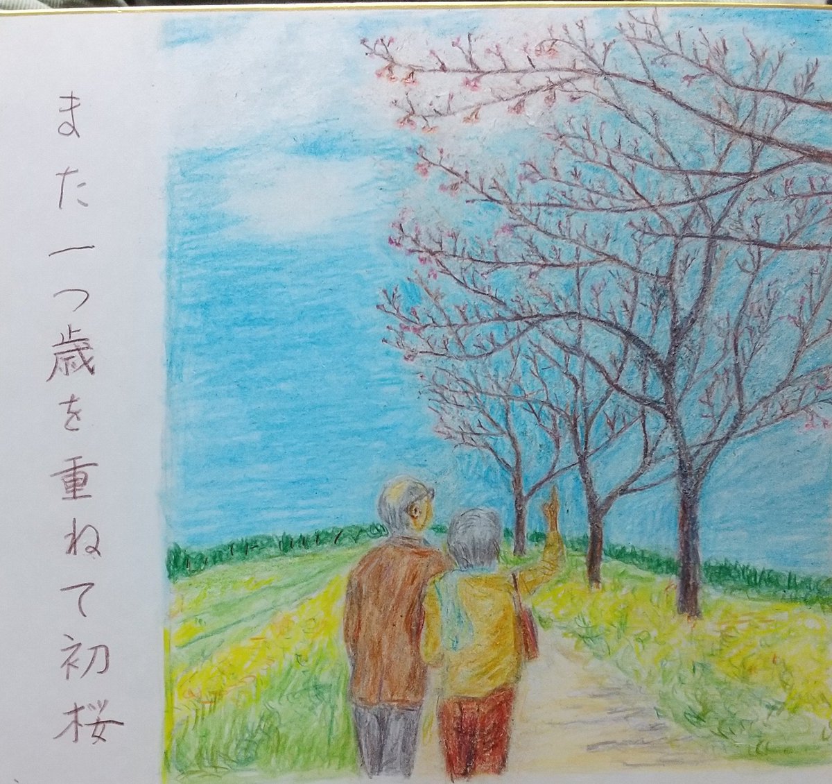 週末には 私の住む町にも 桜前線がやって来る 雨雲の隙間から 晴れ間がのぞいて ほころぶ花を 照らしてくれるだろう #俳句 #初桜 #haiku #AdobeFresco #赤と黒の絵日記 #イラスト #イラスト俳句 #絵描きさんと繋がりたい