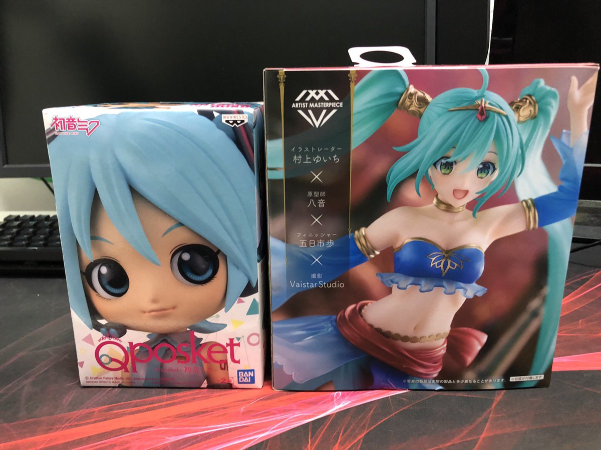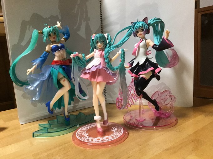 3千円消費してミクちゃんのフィギュア3つ取れた! 多分三ヶ月分の運も消費した……… とりあえず部屋汚いからスケッチブックで隠したけど なんか雰囲気のある可愛い写真が撮れるようになりたい… #初音ミク #初音ミクフィギュア