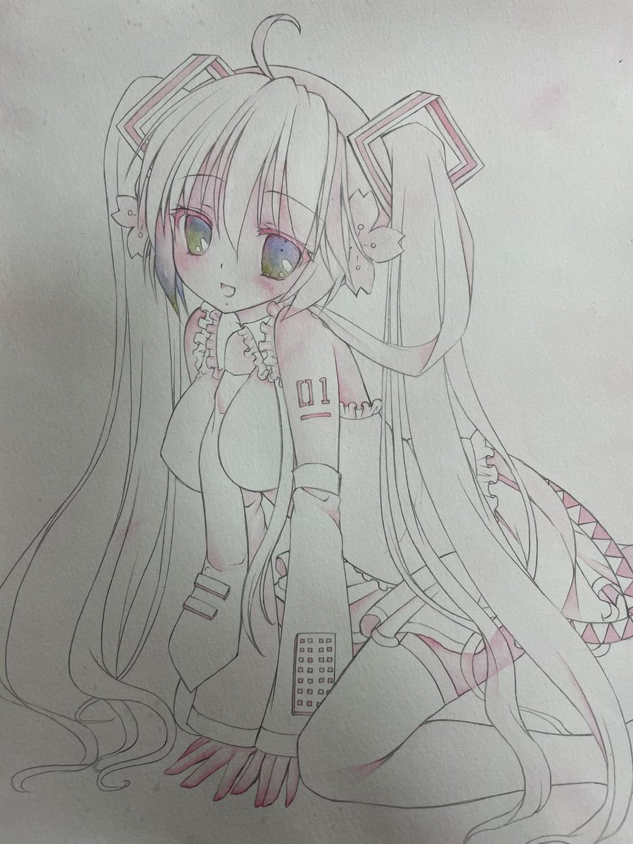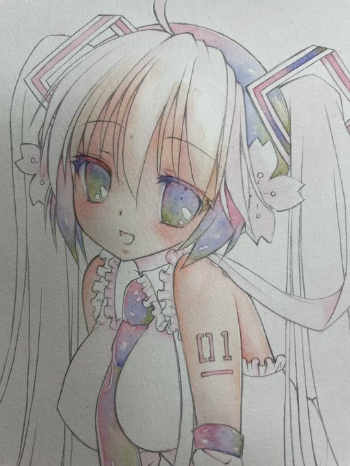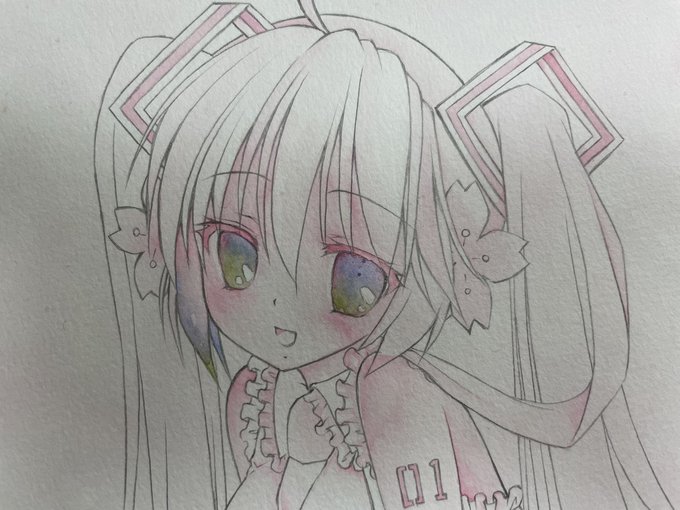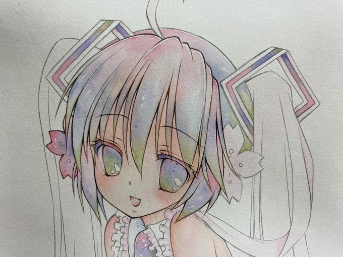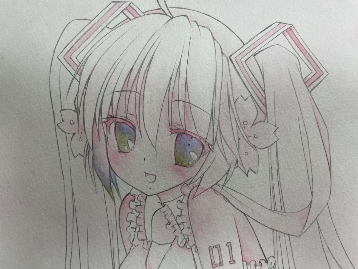 #手描きイラスト #初音ミク手描きイラスト #絵描きさんと繋がりたい ちょびっとだけ🙌 実は下描き間違っちゃってるのよ😑 でも塗っちゃう😭 絵の具の色自作してる方が いるんですね🤔 最近気づきました😅 何だか素敵な色があって💖 目標達成したらちょっと 買ってみたいかも。 (自分のご褒美に🤗)