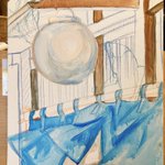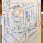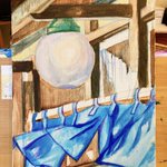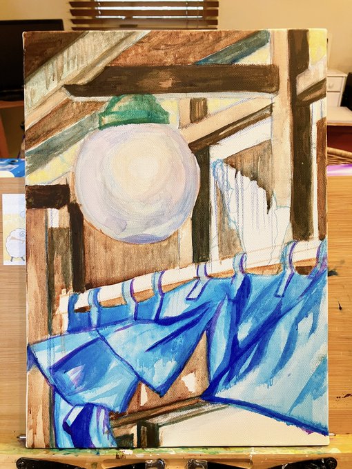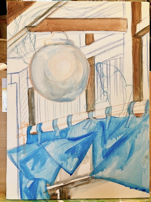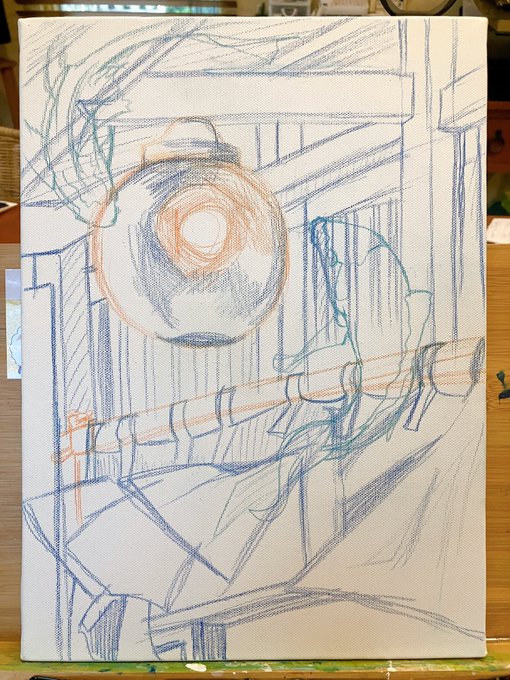 @HolbeinArt 新作制作開始! 「風」がテーマの作品です 照明器具の輪郭がぼやけてたから微調整した! #キャンバス #赤青色鉛筆 #アクリル絵具 #ジェッソ (@HolbeinArt ) #絵描きさんと繋がりたい #創作クラスタさんと繋がりたい #制作過程の写真だけで興味を持ってくれる方へ届け