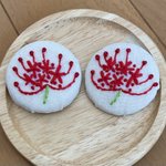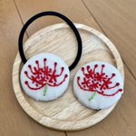 彼岸花のブローチ・ヘアゴムを作りました〜ちょうど彼岸花が咲いてる〜 #彼岸花 #くるみボタン #刺繍アクセサリー #minneで販売中 #誰か優しい人が拡散してくれてフォロワーさんが増えるらしい #作品を載せて自分の作品を知ってもらおう