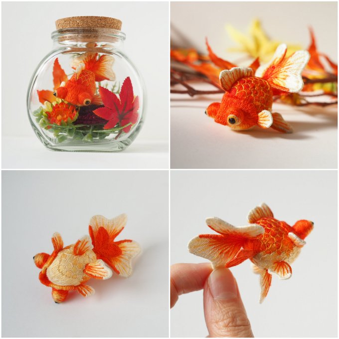 #作品を載せて自分の作品を知ってもらおう 刺繍で立体の金魚を作っています。 手のひらでコロンと泳ぐ手毬金魚。 パーツ作りから組立てまで、接着剤は使わず一本取りの刺繍糸で縫って立体に仕立てています。 #刺繍糸の可能性は無限大