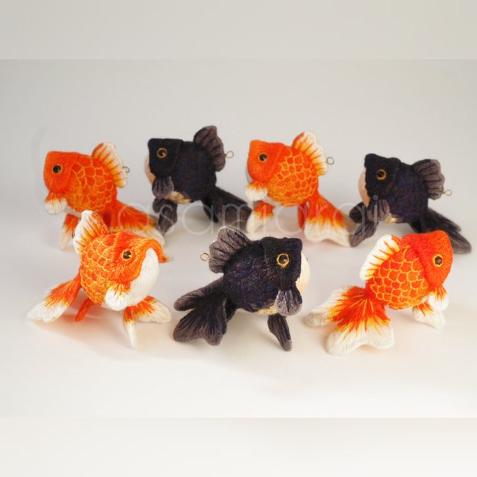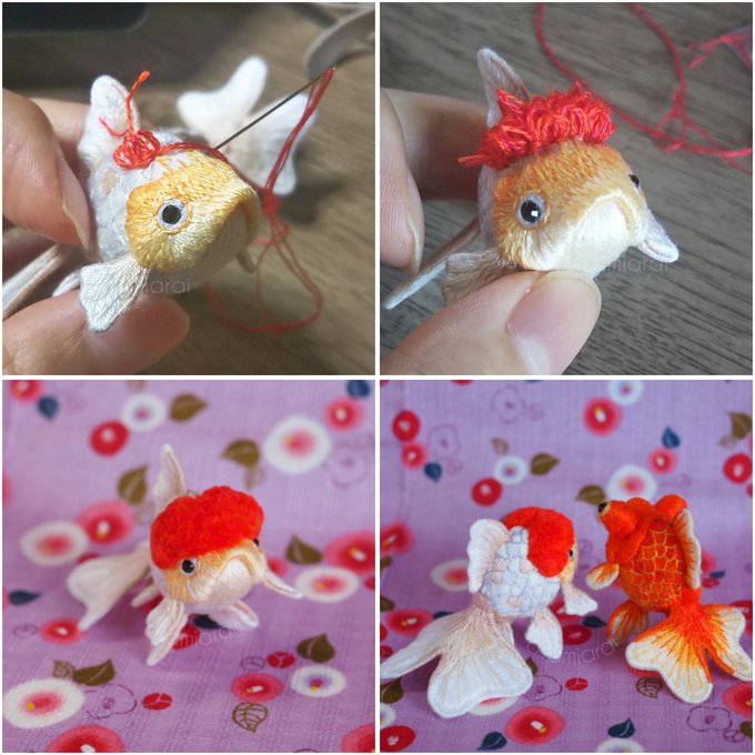 #RTで作家さんの世界を広げるタグ オール刺繍でコロコロした金魚を縫ってます🧵✨ お腹のうろこ模様なんかは特にその時の気分で変えてるので、みんなそれぞれの個性が生まれます。 #手鞠金魚 #刺繍作品です #刺繍造形 #金魚 #embroidery #goldfish