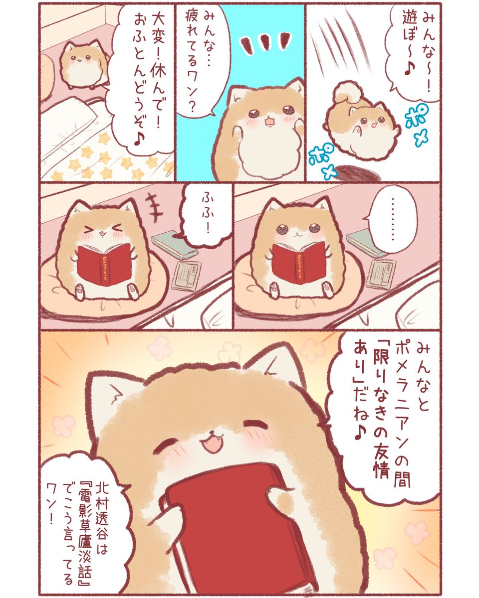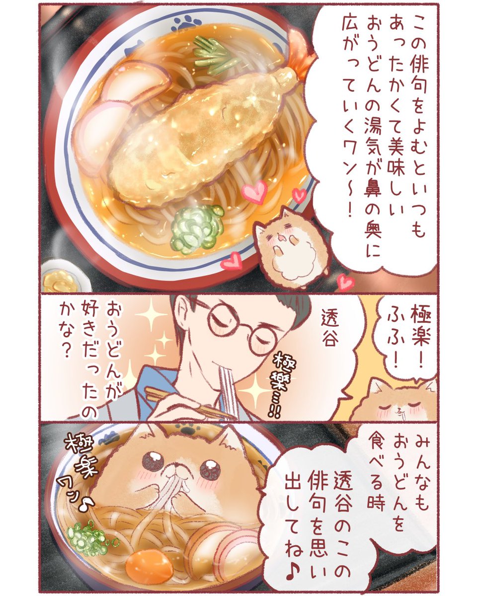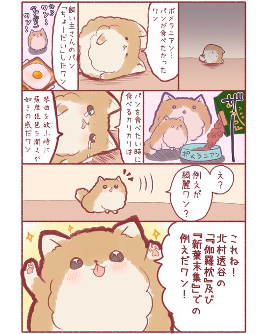ポメラニアン、お腹空いちゃったワン🐾明日はおうどんが食べたいな🐾 みんなはおうどん、好き? 北村透谷の詠んだおうどんの俳句、みんながおうどんを食べる時に思い出してね! 極樂…!ふふ! #漫画が読めるハッシュタグ #ゆるいイラスト #創作文壇