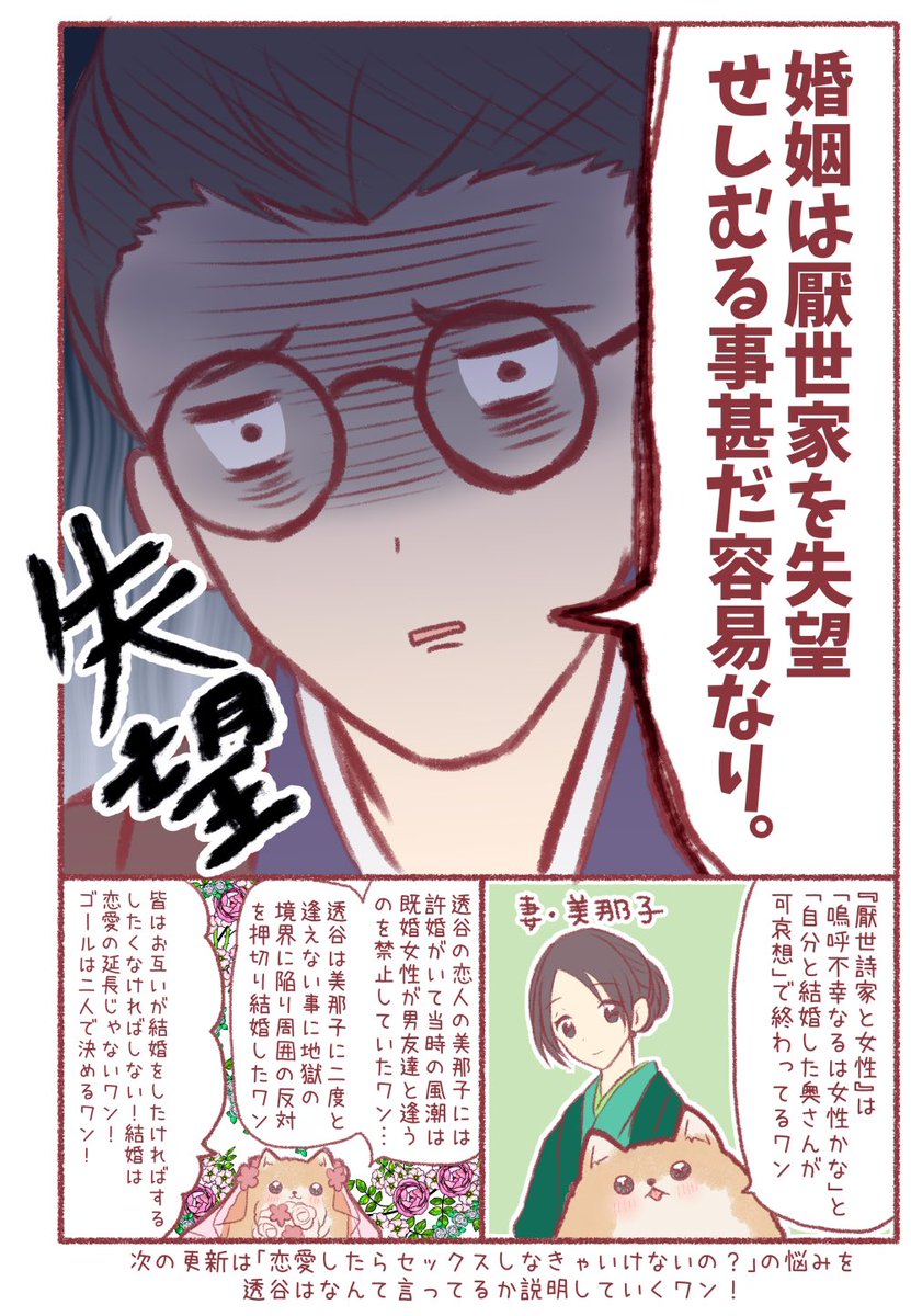 今日は北村透谷が1892年に「女学雑誌」で『厭世詩家と女性』を発表した日だワン🐾 『厭世詩家と女性』は現代の恋愛至上主義の始まりとされているワン🐾 『厭世詩家と女性』で透谷が「結婚」についてなんて書いているかを解説するワン🐾 #漫画が読めるハッシュタグ #創作文壇