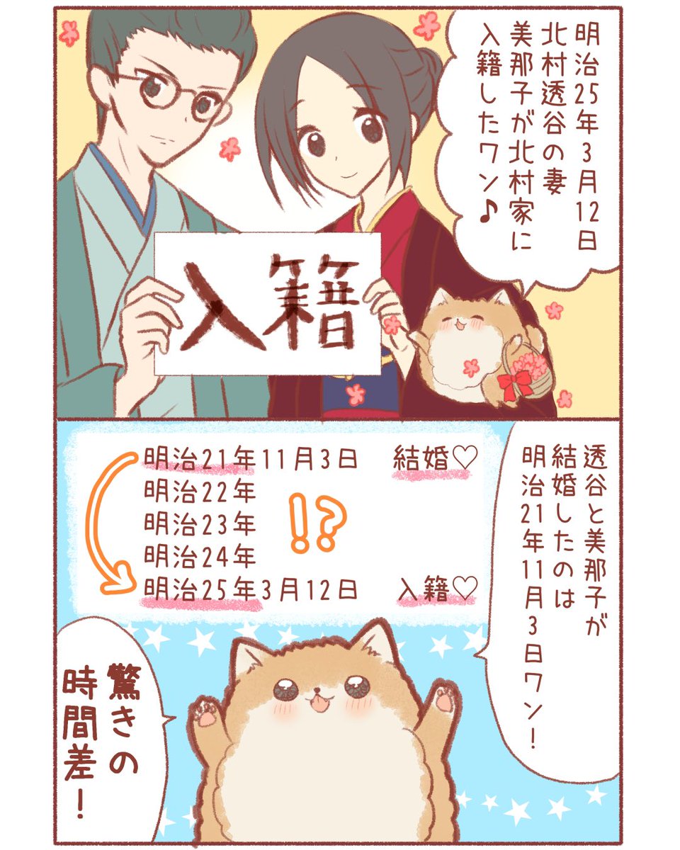 今日は明治25年に北村透谷の妻、美那子が北村家に入籍した日だワン🐾 透谷と美那子の結婚は明治21年11月3日、結婚から3年半後の入籍なんだワン🐾その理由はね…ふふ! #漫画が読めるハッシュタグ #創作文壇