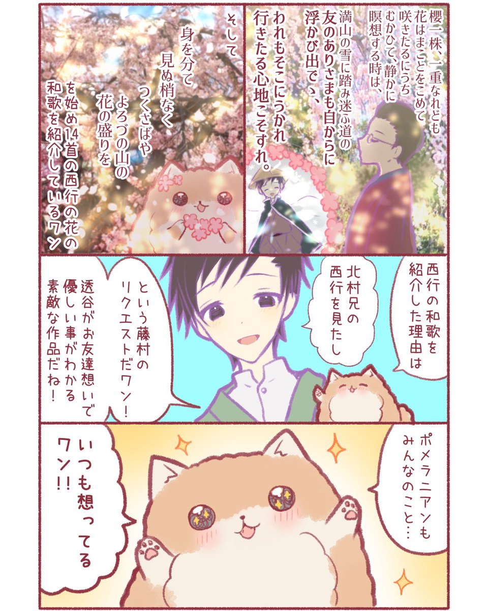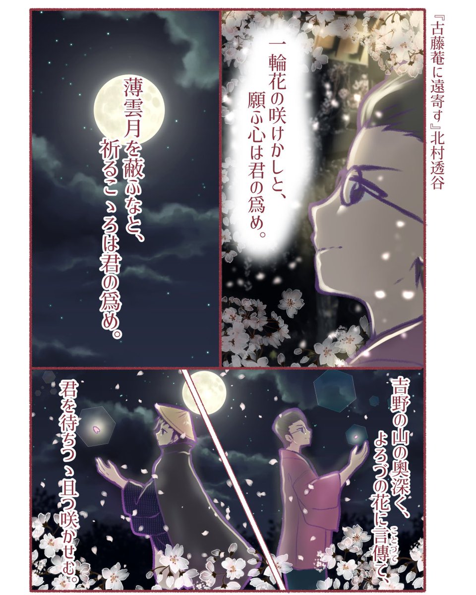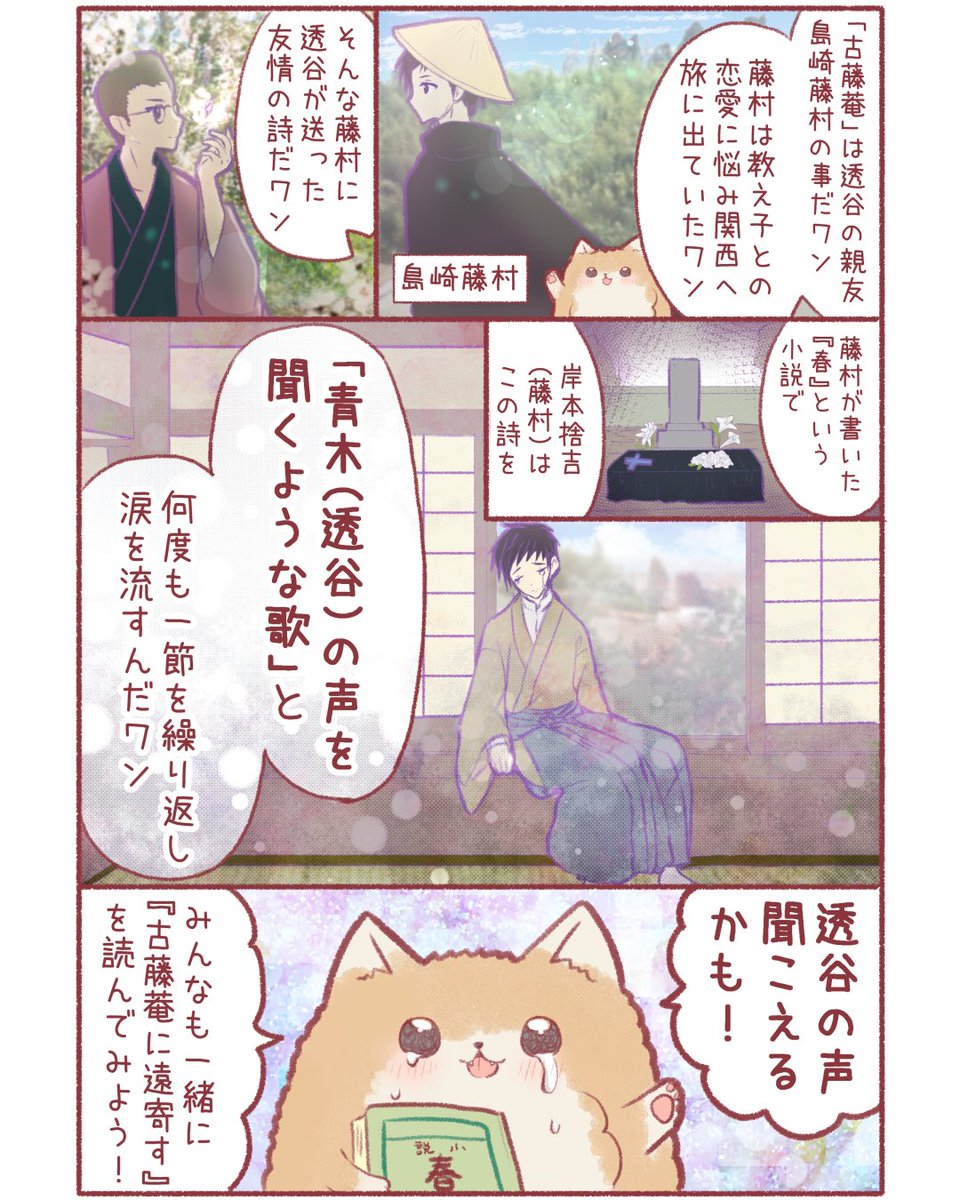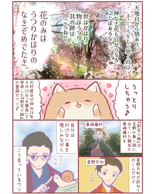 今日は明治26年に北村透谷が「文學界」で『古藤菴に遠寄す』と『五羅漢の賛』を発表した日だワン🐾 透谷が『古藤菴に遠寄す』を書いた時はまだ吉野山に桜は咲いてなくて「藤村の為に一輪でいいから桜の花よ咲いておくれ」と願ったんだワン🐾ふふ!友情ワン🌸 #漫画が読めるハッシュタグ #創作文壇