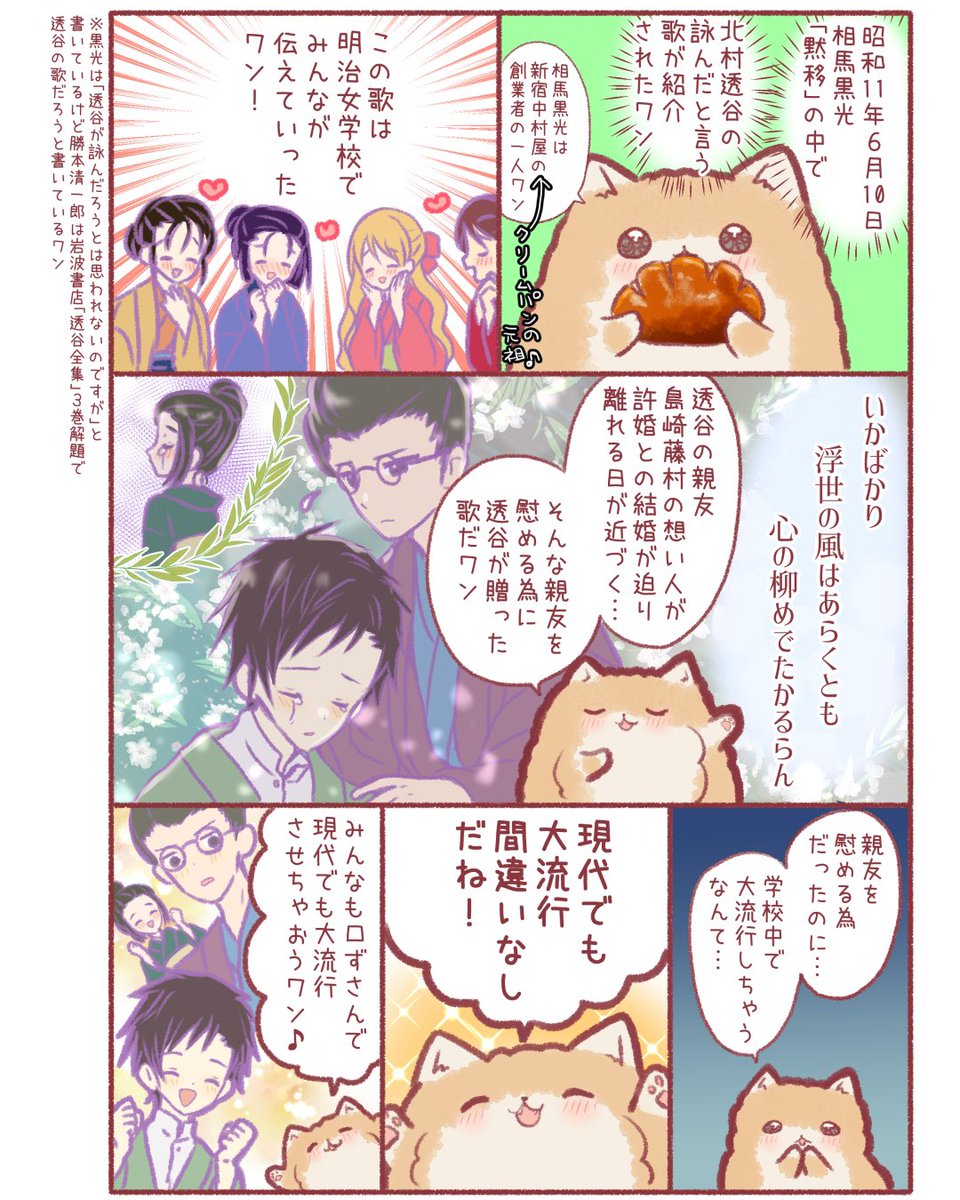 今日は昭和11年、北村透谷の死から42年後 新宿中村屋の創業者の一人である相馬黒光「黙移」で明治女学校で言い伝えられている 北村透谷が詠んだと言われている歌が紹介された日だワン🐾 どんな歌かと言うとね…ふふ! #漫画が読めるハッシュタグ #創作文壇