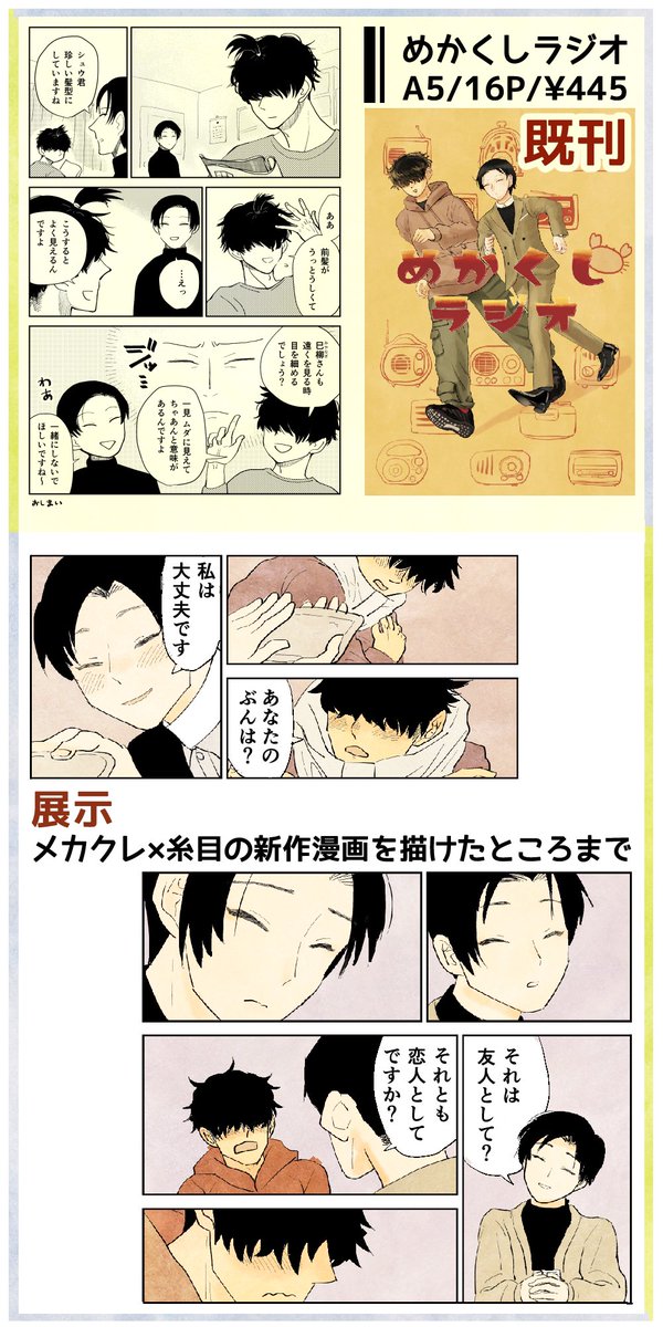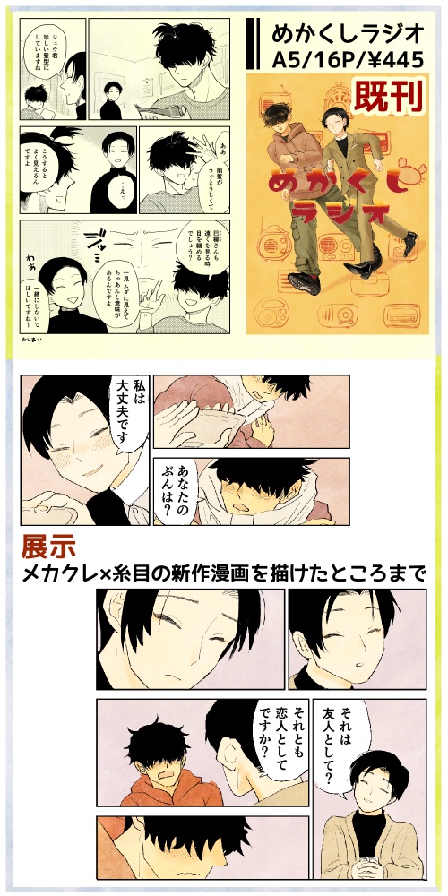 【WEBイベント参加】 6月25日 #創作BLオンリー黒チョコ(会場:pictsquare.net/ltdainy46r8k0z…) スペースは「う2」、左側の真ん中あたりです! 既刊通販と新作展示(予定)!!ほんわかしているけど男前のメカクレ×孤独に生きてきたクールな糸目の漫画です