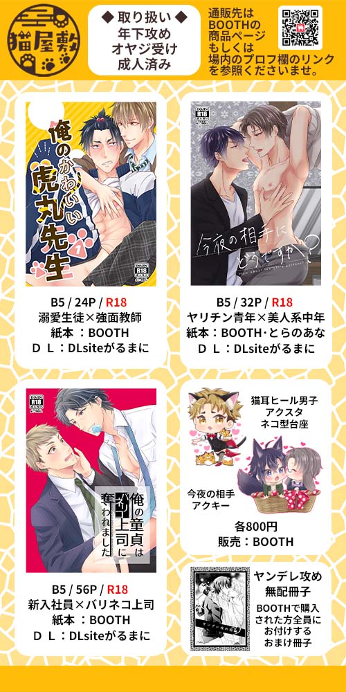 🌸同人のお知らせ🌸 12/25開催のBlack chocolate Love give a present2に参加いたします! スペース:猫屋敷 チョコ い6 既刊のみになりますがよろしくお願いします。 記念撮影などあればお誘いいただけると嬉しいです🙏💕 #創作BLオンリー黒チョコ #創作BLオンリー黒チョコお品書き