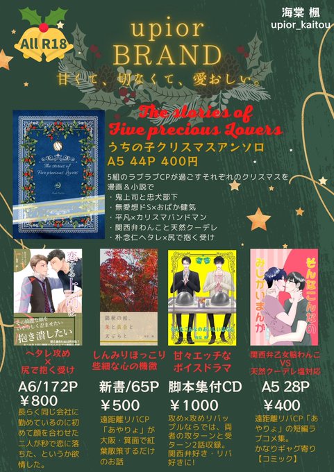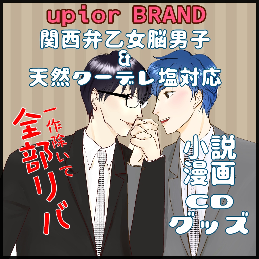 #創作BLオンリー黒チョコ #創作BLオンリー黒チョコお品書き pictsquare.net/m1pjhmok6qiv0z… 【チョコえ8】upior BRAND リアルな日常を舞台に描く、心の機微重視のBL小説。 甘かったり切なかったりちょっと笑えたり。 関西弁わんことムッツリクーデレの二人が看板CPです。 リバ、関西弁お好きな方是非!