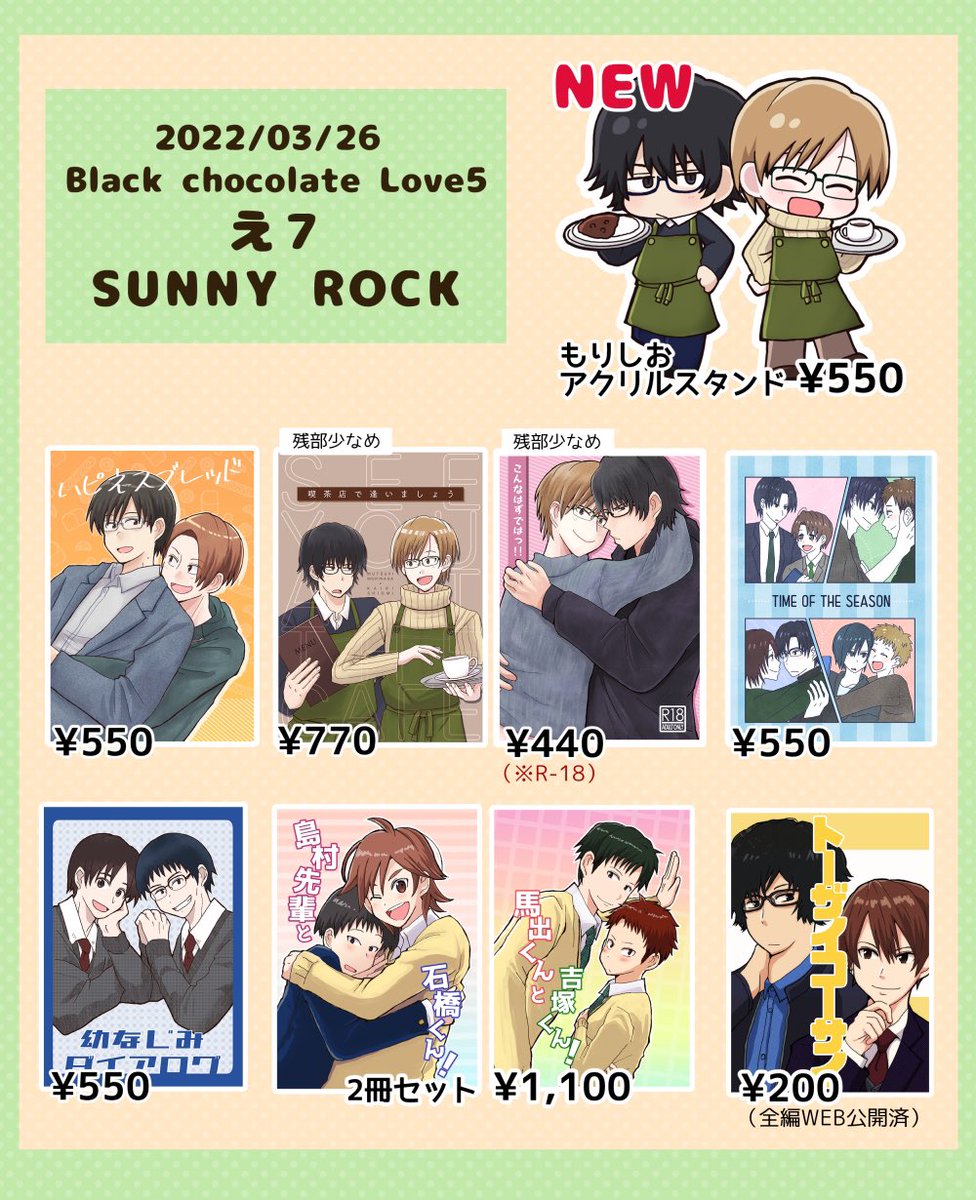 3/26開催のBlack chocolate Love5にサークル参加します! スペース:え7[SUNNY ROCK] 新作はアクスタになります! 頒布の他にネップリと漫画展示(スペースにてパス公開)も予定しております。 当日は宜しくお願いします! #創作BLオンリー黒チョコお品書き #創作BLオンリー黒チョコ #創作BL