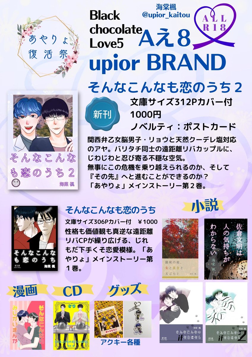 #創作BLオンリー黒チョコお品書き #創作BLオンリー黒チョコ pictsquare.net/050a7lev8rezjr… 3/26開催の黒チョコ5【Aえ8】 「upior BRAND」で参加します。 新刊「そんなこんなも恋のうち2」 MAPには「日常系・リバ・リーマン・ML」と表示しています。 関西弁・リバ好きな方是非お越しください。