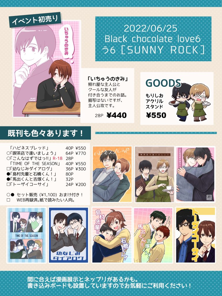 #創作BLオンリー黒チョコお品書き 明日6/25、ピクスペイベント「black chocolate love6」に参加します お品書きに無配(展示)の件を描き足しました。展示物はBOOTHに置く予定。今頑張って4P目書いてます スペースは【い6】です。紙本メインですがDL版のみの作品もあります お気軽にお立ち寄りください