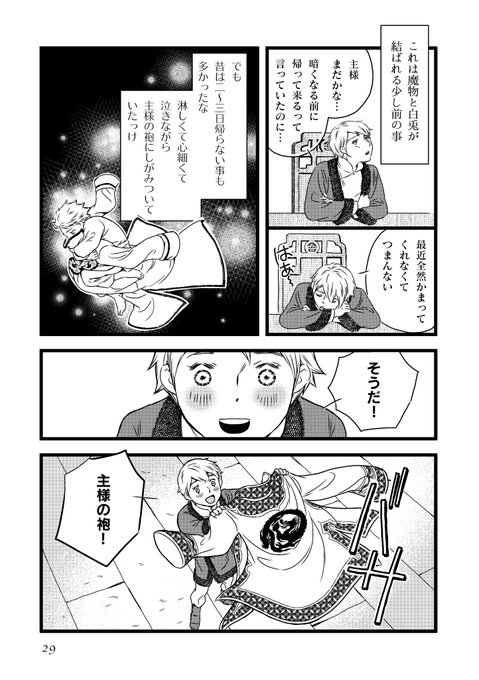 人喰いの魔物と飼育された少年の物語。 寂しさを紛らわすため大好きな主様の服を身にまとう白兎、まだ結ばれる前のほのぼのとした短編です。「魔物の接吻」収録。1/3 シーモア cmoa.jp/title/264121/ Amazon amazon.co.jp/%E9%AD%94%E7%8…… 明日まで #創作BL大豊作まつり #漫画が読めるハッシュタグ