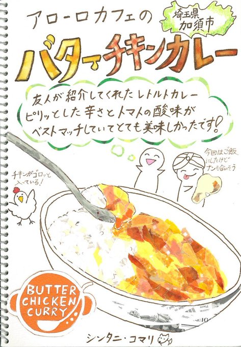 コマリのご飯絵日記🐱 埼玉県加須市のアローロカフェの「バターチキンカレー」 スパイスの辛さとトマトの酸味が丁度よく美味しかったです! ふるさと納税でも買えるので是非😄 #埼玉県 #加須市 #アローロカフェ #絵描きさんと繫がりたい #イラスト #Illumination #マステ絵