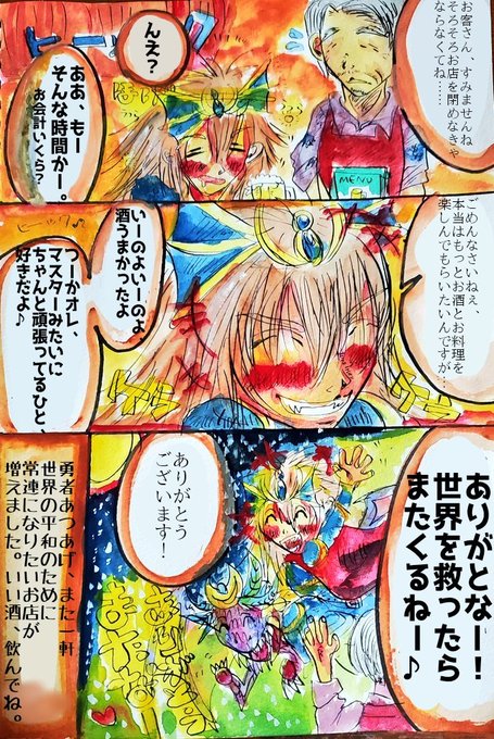 タグ失礼します。酒好きな「勇者あつあげ」と仲間たちによる、ギャグRPG風イラストや漫画を描いています。 ラストはキービジュアルイラストとなります。よろしく。😊✨ #漫画が読めるハッシュタグ #漫画好きと繋がりたい #絵描きさんと繋がりたい #アナログ絵描きさんと繋がりたい #勇者あつあげ