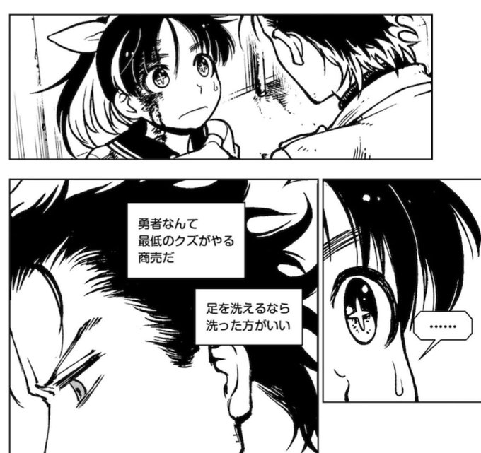勇者のクズ最新話、「勇者の闇」を更新しました。何も見えない中で手練の剣士を制するには? ヤシロの性能がひとつ明らかになる回です。 ボーダー:comicborder.com/episode/485600… ニコニコ:seiga.nicovideo.jp/comic/35205 第1話はこちら→amzn.to/3Ydj4gV #勇者のクズ