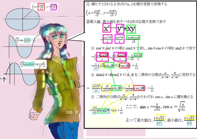 #フォロー返します #相互フォロー募集 #みんなで楽しむTwitter展覧会 #絵描き人 #oc #ArtistOnTwitter #勉強垢 #早稲田 #早大 #媒介変数 #Parameter #2倍角 #Doubleangle xyがない2x²+3y²=1はcos2θになり、 xyがあるx²-y²+xyはAcos²2θ+Bsin²2θの形式を経てsin(2θ+α)になる点が重要です。