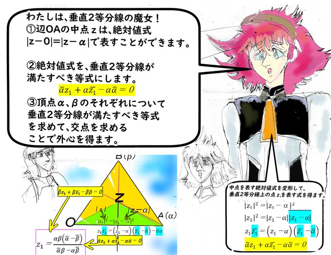 #みんなで楽しむTwitter展覧会 #illusRT #ArtistOnTwitter #絵描き人 #complexconjugate #外心 #勉強垢 #山形大 #共役複素数 #水星の魔女 ガンダム好きの受験生の皆様を支援(似てないところはご勘弁))。|z-α|²=z²、|z-β|²=z²を展開し複素平面における交点を求めるところがポイント。