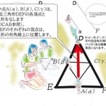 #みんなで楽しむTwitter展覧会 #illusRT #ArtistOnTwitte #複素平面 #勉強垢 #イラスト #oc 頂点A(α)、B(β)、C(γ)を辺の中点とするような三角形。 頂点ABCを3頂点とする平行四辺形の4つ目の頂点Dはβ+γー2α。頂点Dから題意の三角形を求める。それはβ+γーα、α+βーγ、βーα+γとなる。