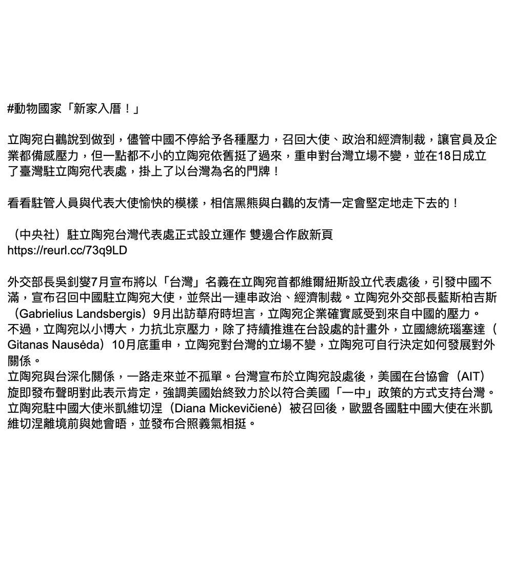 #動物國家 「立陶宛再贈疫苗」 一點都不小的立陶宛除了努力呼籲歐盟夥伴們一起對抗極權以外,還不忘繼續送給臺灣黑熊禮物!讓我們一起到推特留下感謝吧~ 立陶宛政府推特:mobile.twitter.com/lithuaniangovt…