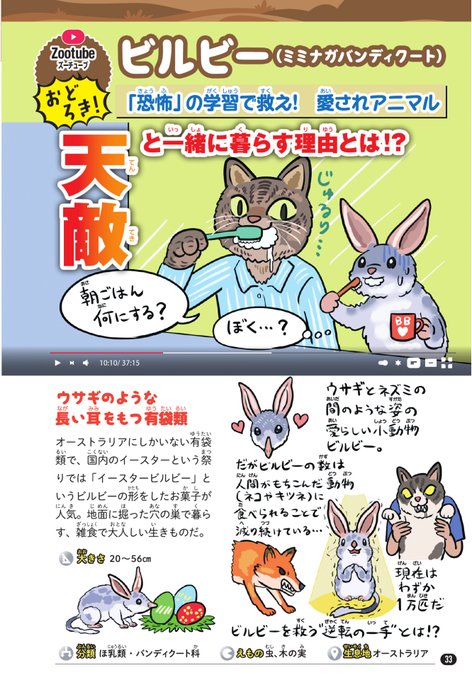 本日3/20は #動物愛護デー なので、放っとくとスピーディに絶滅しそうな脆弱な動物を守るための試行錯誤を紹介。ウサギによく似た有袋類ビルビー(別名ミミナガバンディクート)を救う鍵は…「恐怖」!?(新刊 #ゆかいないきもの超図鑑 より)