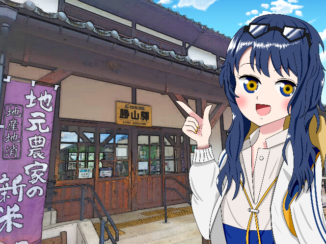 ていら『どう?勝山いいでしょ』 今回背景写真をイラストっぽく加工することにチャレンジ。元写真は雨だったのですが強制的に晴れに加工(しかもイラストの空で)してみました。アニメみたいに見えたらしてやったりです。 このていらちゃんは元はアクキー用です。 #勝山ていら #駅メモファンアート