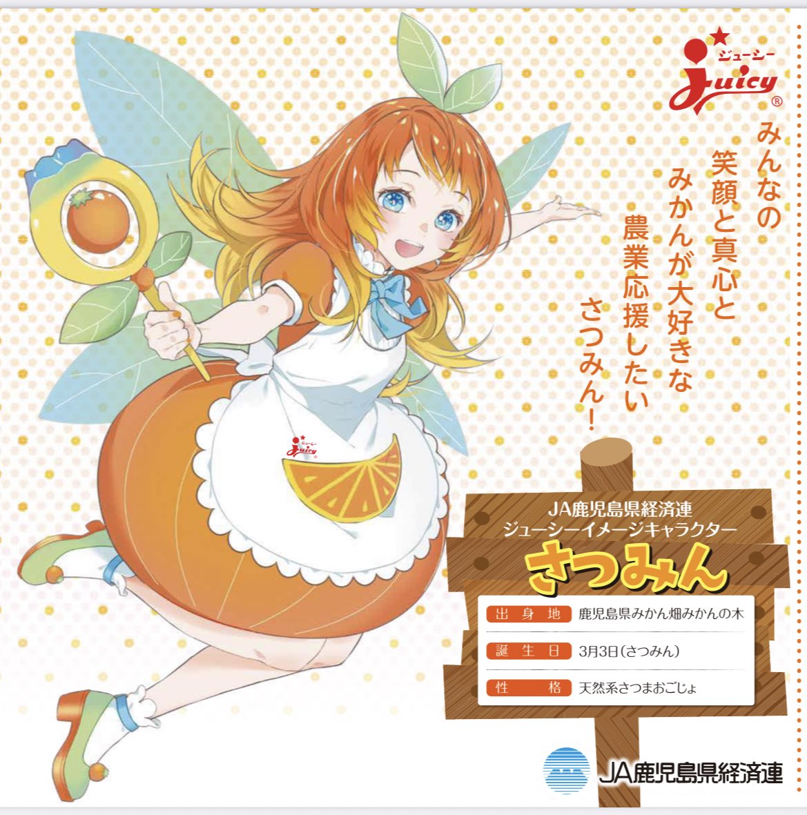 【🍊お知らせ🍊】 この度、JA鹿児島県経済連ジューシーイメージキャラクター「さつみん」を描かせていただきました! お近くのJAに、もしかしたらさつみんがいるかも! 可愛くジューシーにお届けしていきます!どうぞよろしくお願い致します😊🙏 karen-ja.or.jp/service/juicy/ #勝手に鹿児島大使 #JA鹿児島