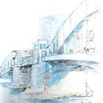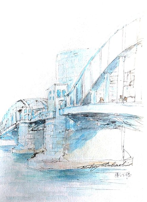 #りえこさん冒険の思い出 その633 東京築地は勝鬨橋。跳ね橋が開いたのは、これも遠い昔の話。今開いたら交通渋滞に。隅田川に架かる橋では歴史がある橋の風景〜かな? #絵 #旅 #水彩画 #スケッチ #watercolor #勝鬨橋 minne.com/ritakahashi4 rieko44.base.shop