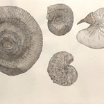 こんにちは✨WANOEです☆ アンモナイト達・オウム貝 (写真模写・水彩) F 1号 スケッチブック 画用紙・鉛筆・不透明水彩 2001頃 最近 化石は描いてないかも〜☆ #絵描きさんと繋がりたい #アンモナイト #オウム貝 #化石 #アート好きな人と繋がりたい #水彩画 #artwork #watercolorpainting