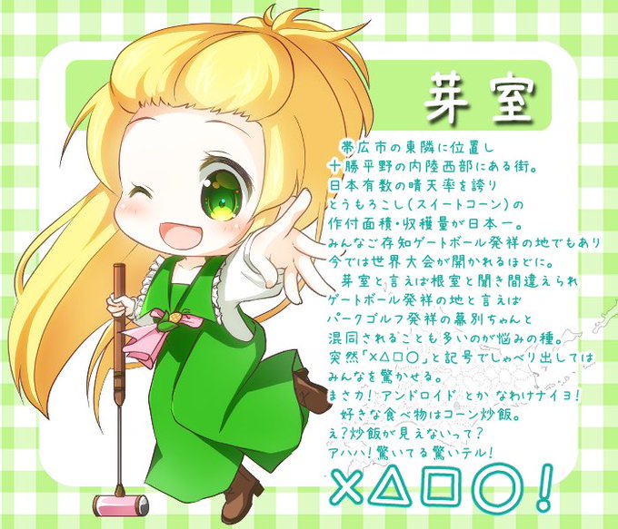 十勝地方のキャラ一覧にシレっといたこの娘が北擬展さんで初登場の新キャラ・芽室ちゃんでした! 金髪+緑でとうきびを意識つつタイピンでダメ押しのもろこしです(苦笑)そしてまさかの人外ちゃん…?そンナことナイヨ!! #どさんこ娘。 #北擬展 #北海道擬人化イラスト展