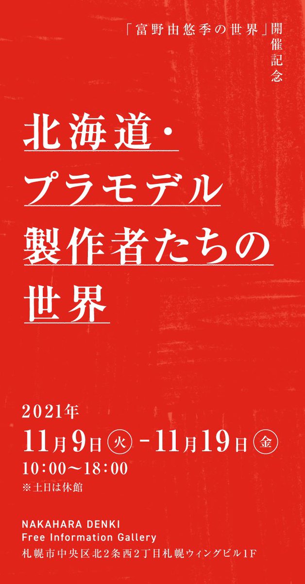 HBC創立70周年記念「富野由悠季の世界」開催記念 #北海道・プラモデル製作者たちの世界 11 月 9 日〜11 月 19 日(10:00〜18:00) ※土日は休館 時計台ビル北側にある中原ビル1F「フリーギャラリー」にて開催! 自分はMGハイニューとRE100シャッコーを展示します! よろしくデス!!