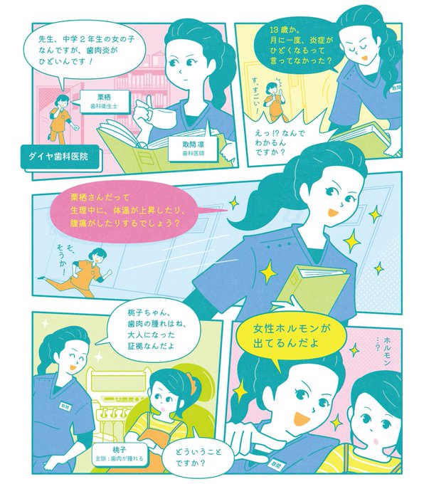 11/1発売『デンタルダイヤモンド11月号』 イラスト漫画描かせていただきました dental-diamond.co.jp/item/1033 歯科女性学入門 ココロとカラダとお口の変化 連載第2回「女性ホルモンと思春期性歯肉炎」 です。 取間凛(とるまりん)さんが動き出すと星がキラキラする設定です✨ #医療漫画 #医療イラスト twitter.com/fukui164/statu…