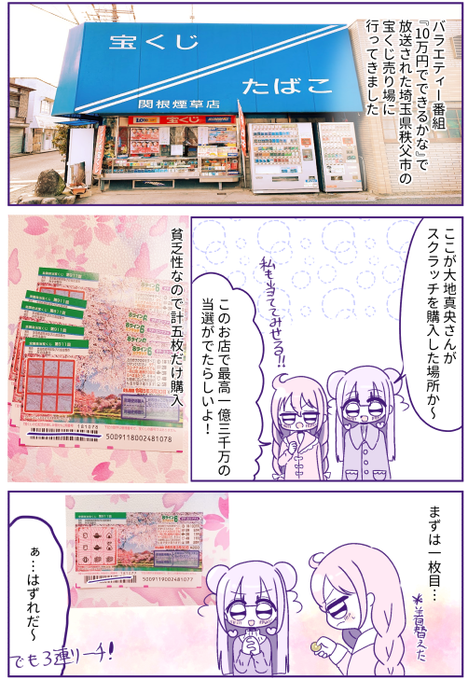 世間はバレンタイン一色ですが私は #十万円でできるかな で #高地優吾 さんと #大地真央 さんが訪れた埼玉県秩父市の宝くじ屋さんで実際にスクラッチを購入してきました✨ 果たして高額当選するのか!😳💰✨ #秩父市 #漫画が読めるハッシュタグ #三連休はフォロワー様が増える